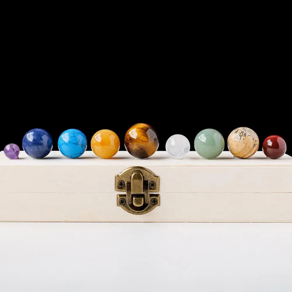 Experience cosmic elegance and spiritual harmony with our 9 Planets Solar System Quartz Stones Set—a stunning decorative gemstone collection housed in a beautifully crafted wooden box. Each of the nine quartz stones represents a planet, infused with natural energies believed to promote health, good luck, and spiritual balance. Perfect for space enthusiasts, gem collectors, graduates, science teachers, and anyone passionate about natural gemstones and astronomy, this set not only elevates your decor but also offers profound spiritual benefits.